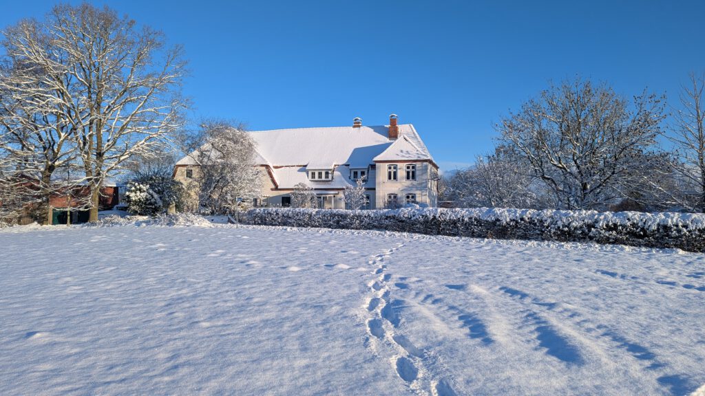 Das Landhaus Rosenduft ist so einzigartig wie die Halbinsel Schwansen. Gerahmt von Weissdornhecken, einem dicht bewachsenen Bachlauf und großen alten Bäumen liegt das Anwesen auf einer Anhöhe und prägt das Landschaftsbild.